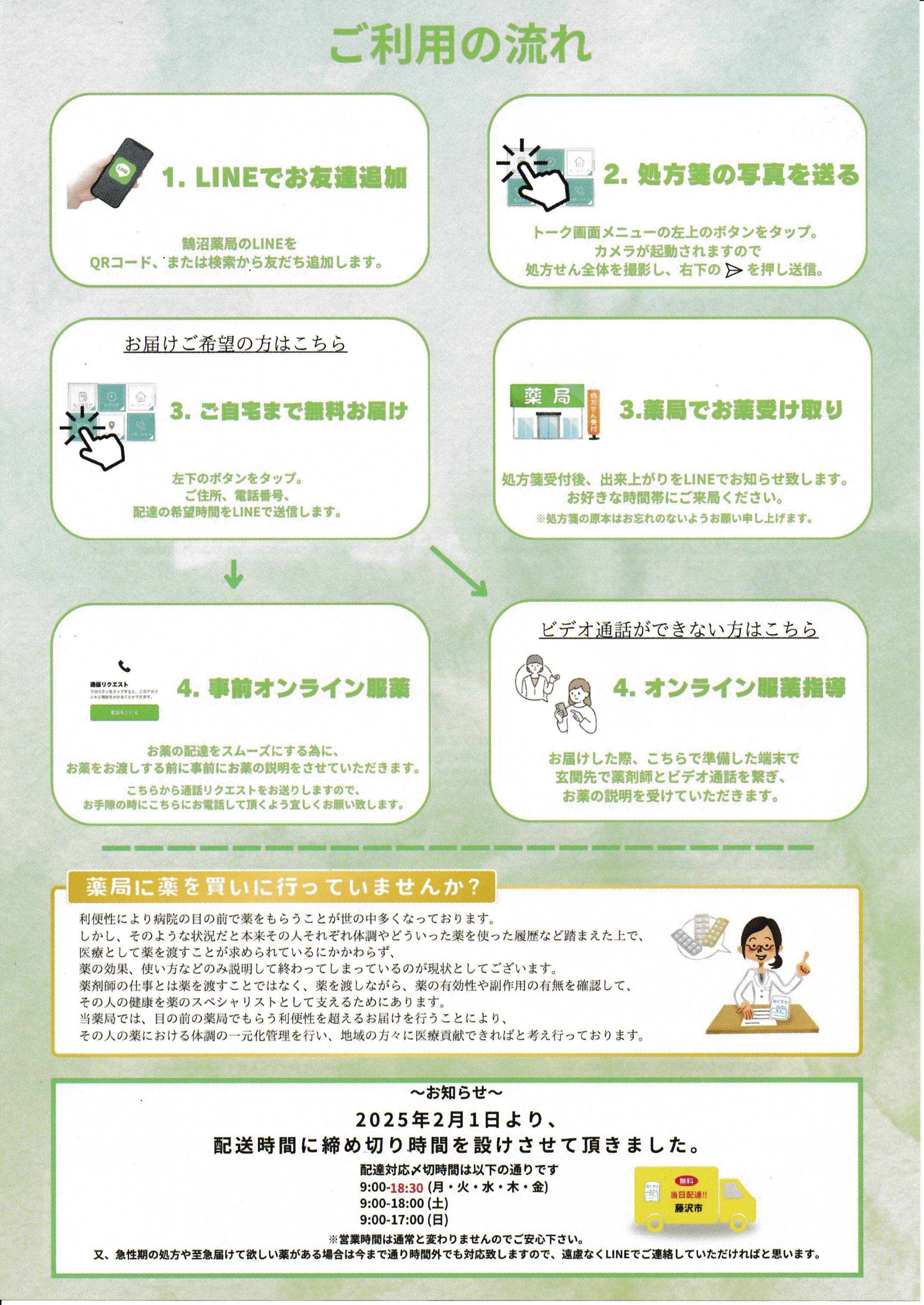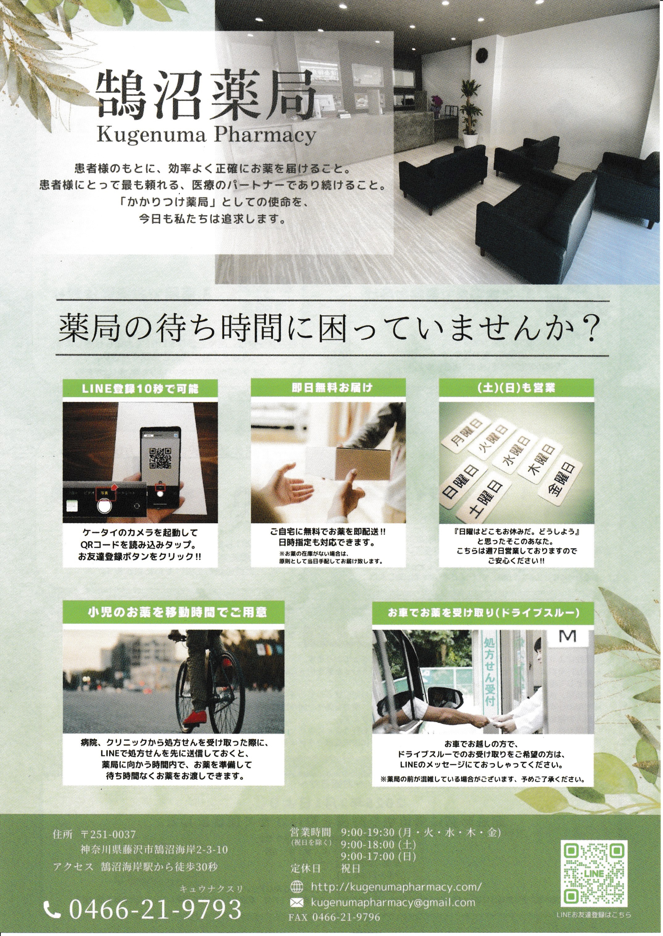 鵠沼薬局から処方薬をLINE登録もしくは当院からのFAXで配送できるようになりました。